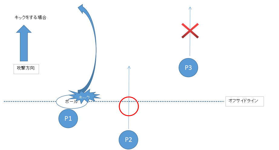 2)キックをした場合、キッカーより後ろにいる人(P2)は前に走ってOKです。