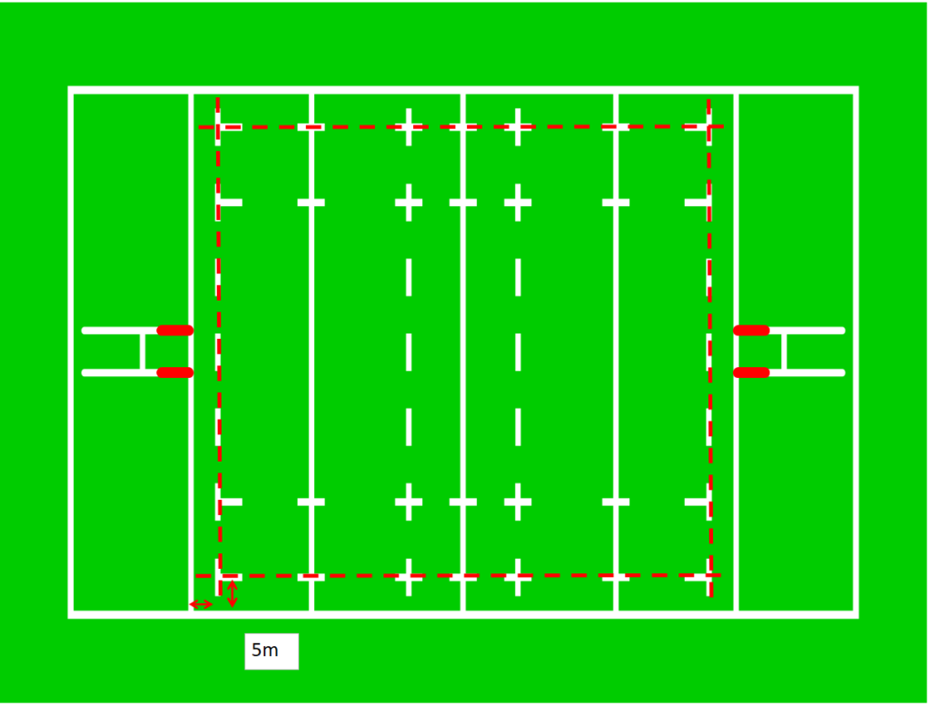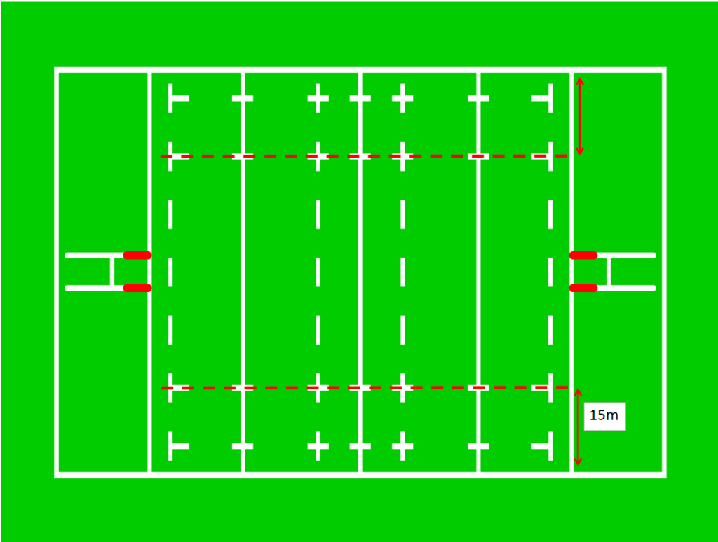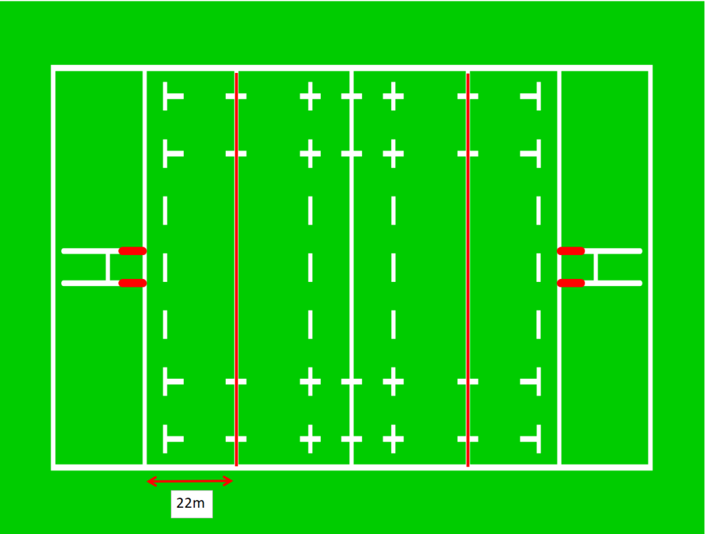 そして、トライゾーン(図のオレンジ線部分)は6~22mとけっこう差があります。観戦時にこのグラウンドはトライゾーンが大きいな、小さいなと見るのも面白いかもしれません。