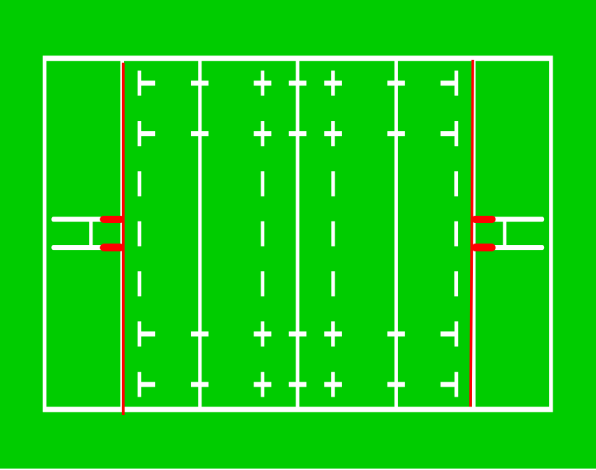 トライゾーンの端です。キックしたボールがここを超えてしまうとトライはできません。